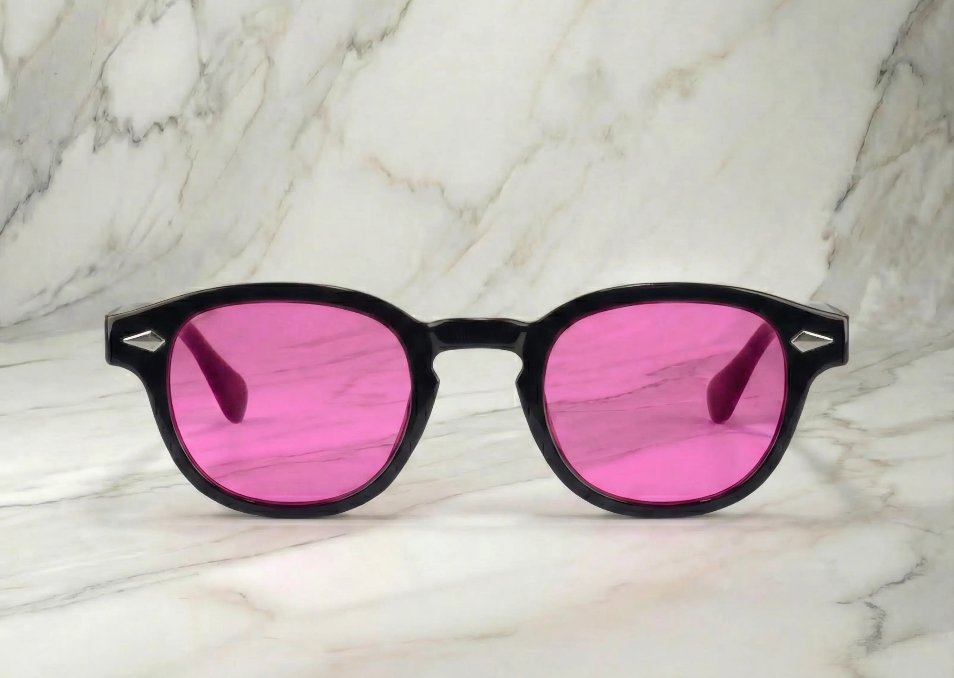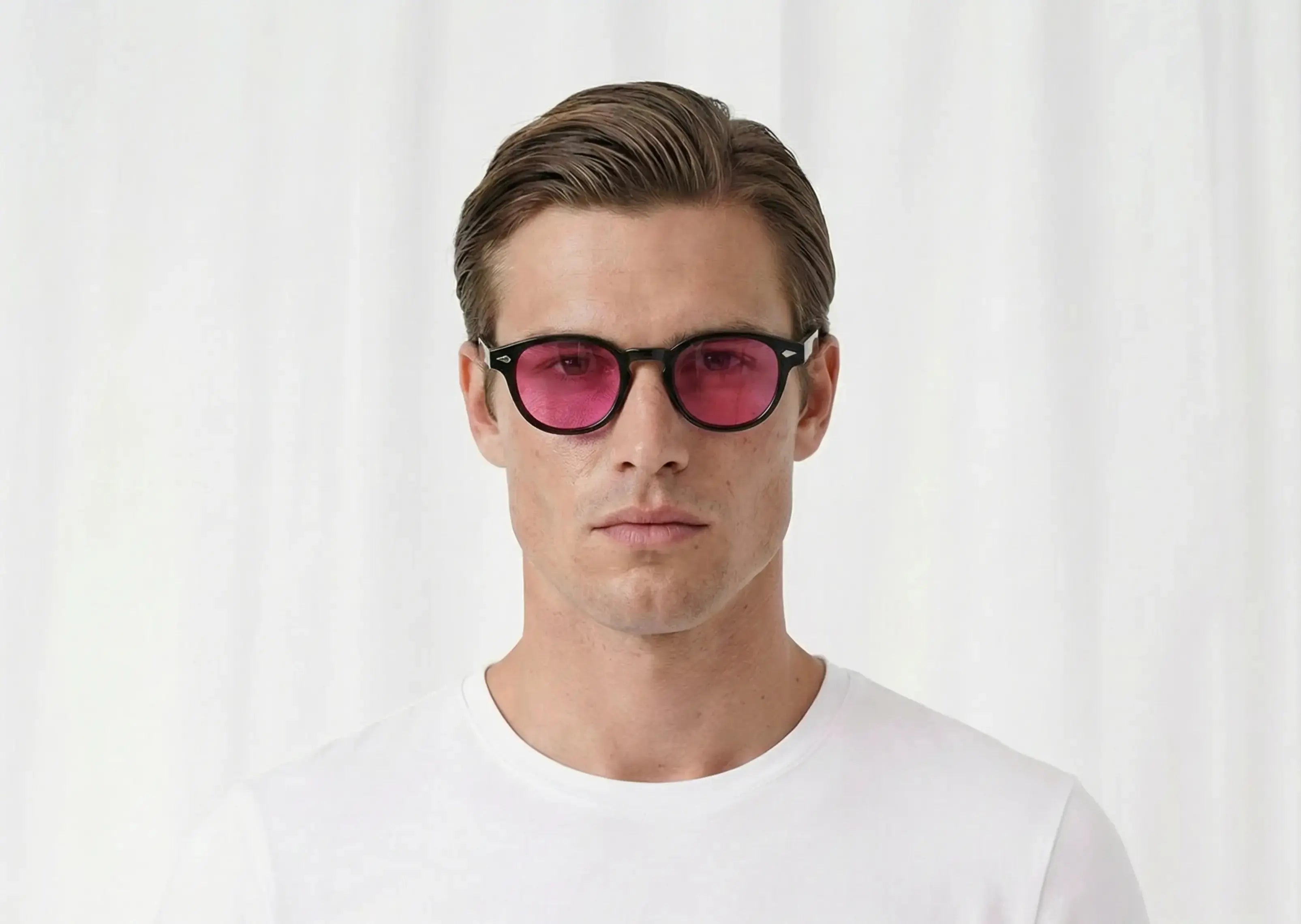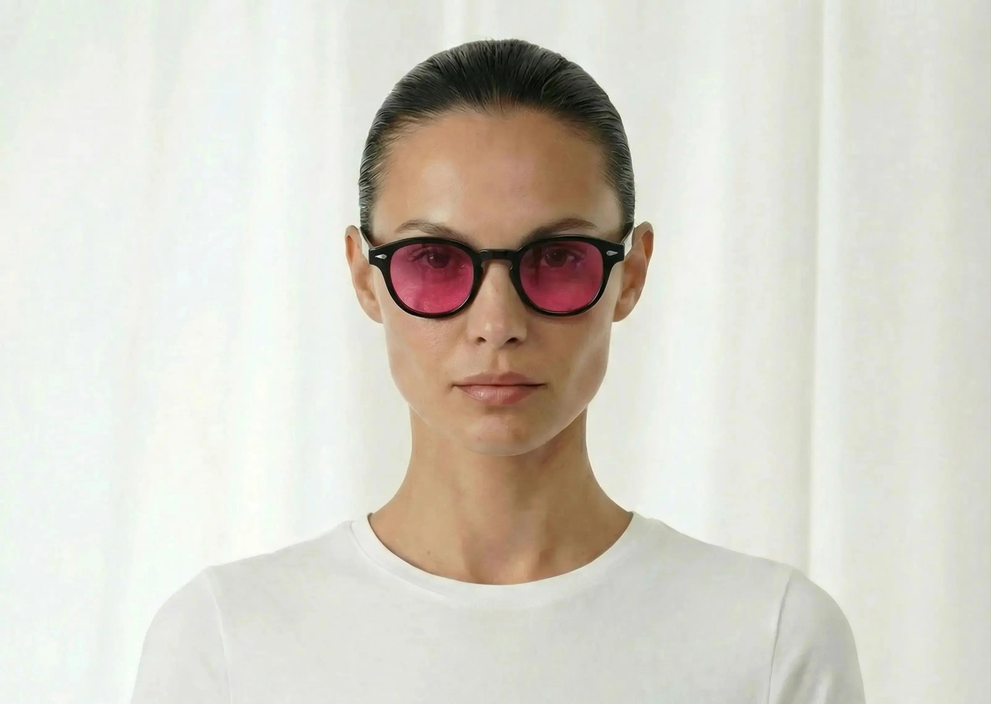 La monture noire structure le visage et donne de la profondeur, tandis que les verres roses apportent une lumière douce, presque chaleureuse, qui transforme le regard et l’atmosphère autour de soi.