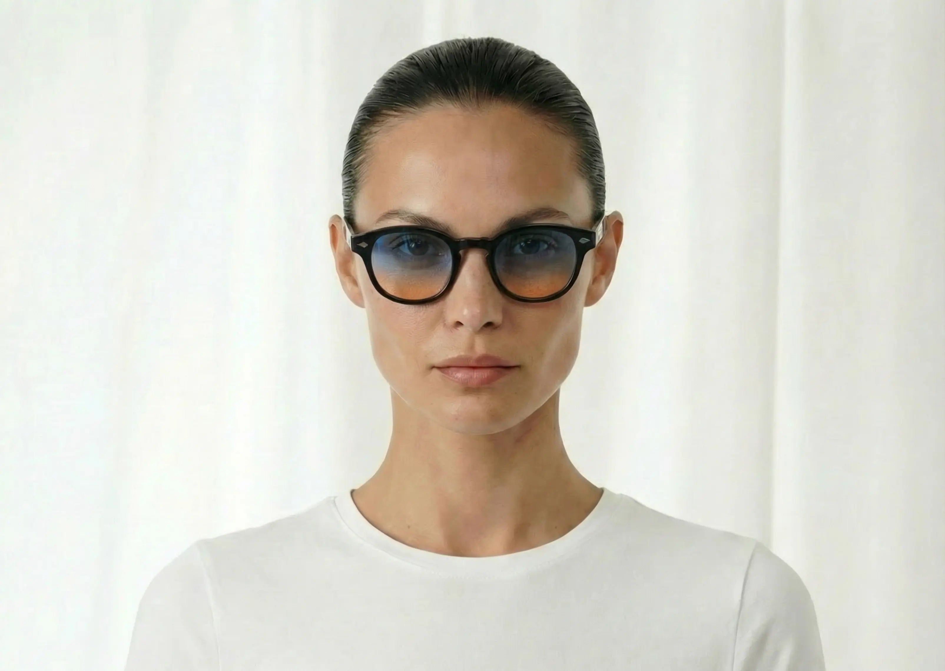CALYPSO, une monture noire profonde associée à des verres dégradés bleu et ambre, inspirés des fins de journée baignées de lumière.